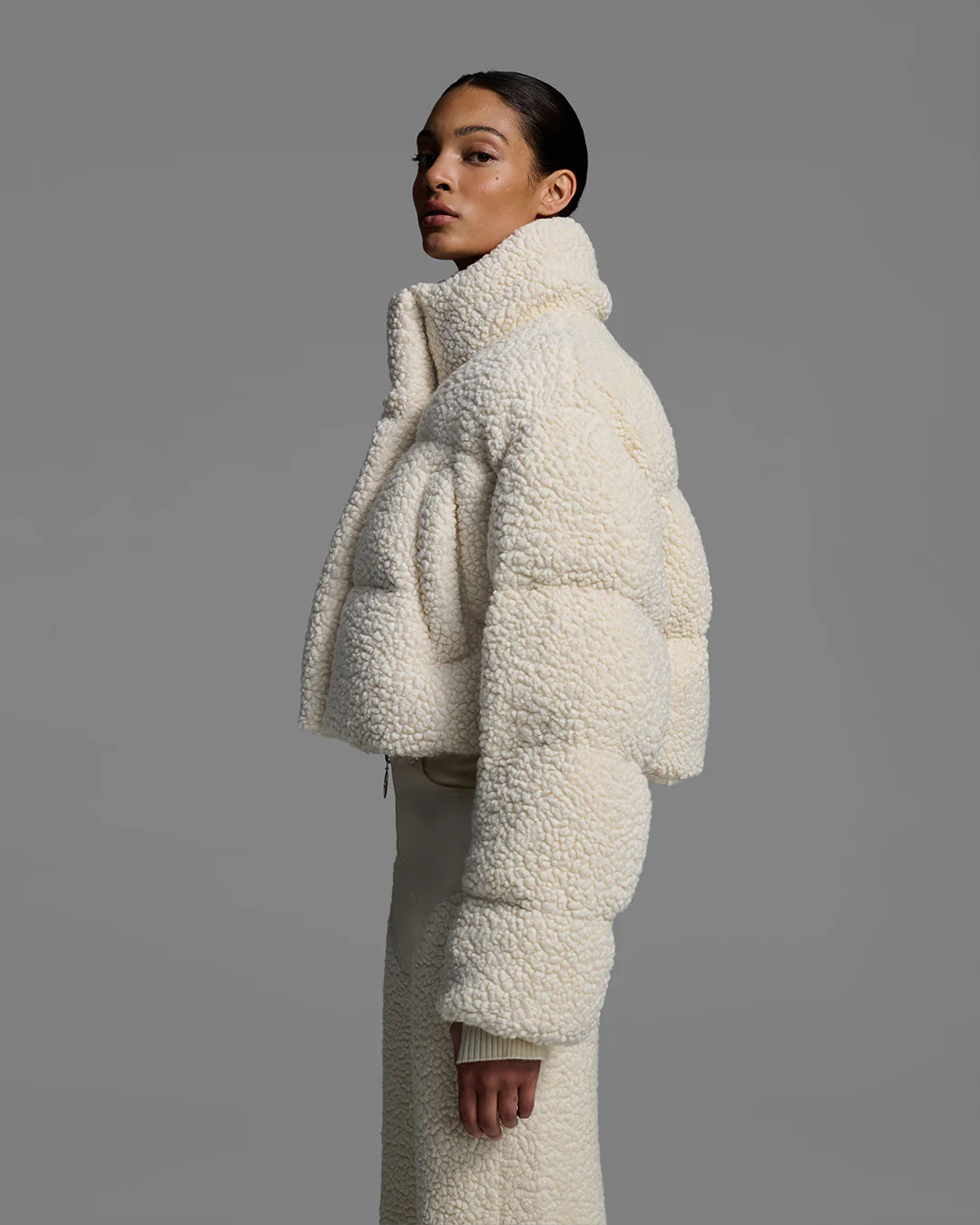 The Kozzy resortwear and après puffer is crafted from natural sherpa for exceptional softness and warmth. Designed for effortless off-mountain style, it embodies cozy luxury with a relaxed silhouette. Pair with the Kozzy pant for a complete après ensemble.